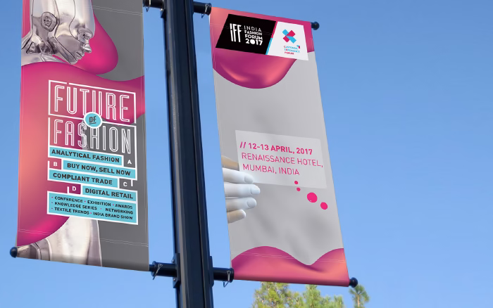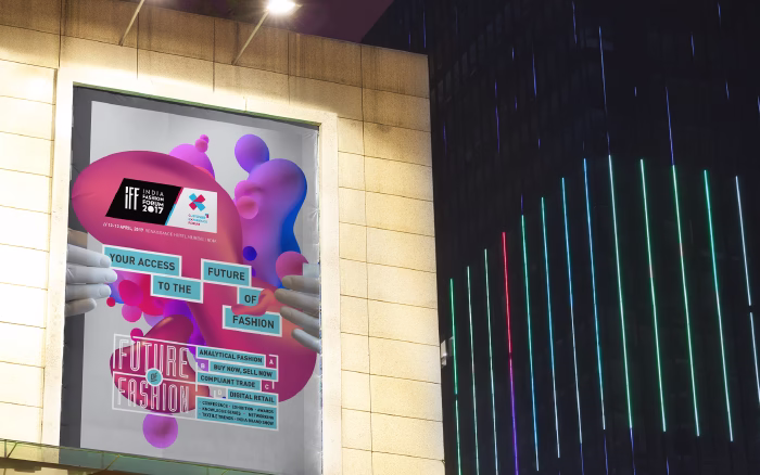 The 17th edition of the India Fashion Forum (IFF) in 2017, organized by IMAGES GROUP, emphasized the fusion of technology and fashion. Vibrant 3D fluid forms combined with futuristic croquis defined the dynamic visual identity, reflecting the event's focus on innovation, collaboration, and industry evolution.