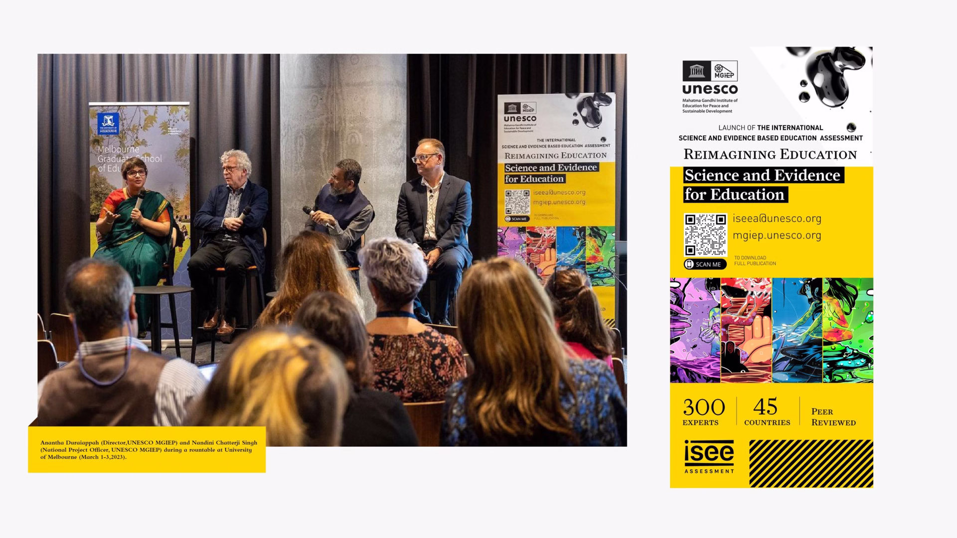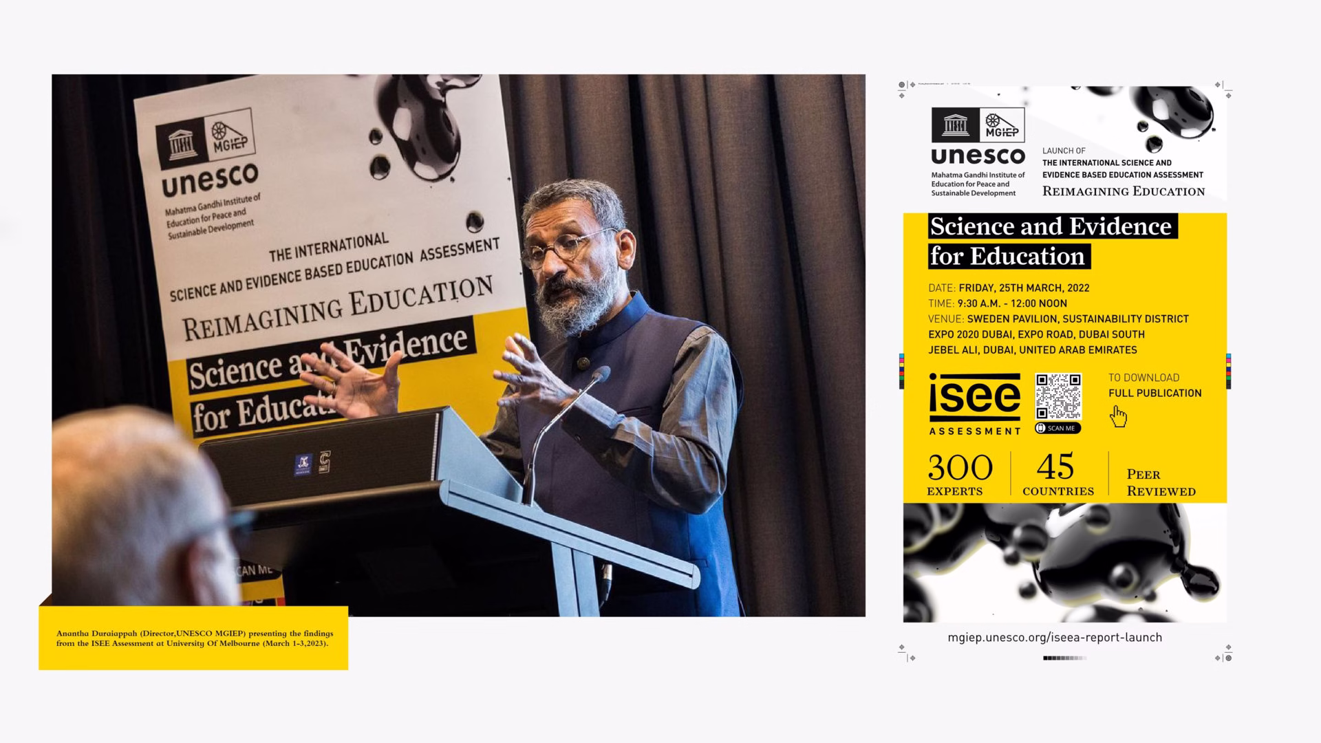 The International Science and Evidence-based Education (ISEE) Assessment is an initiative of the UNESCO Mahatma Gandhi Institute of Education for Peace and Sustainable Development (MGIEP), conceived as its contribution to the Futures of Education process launched by UNESCO Paris in September 2019. In order to contribute to re-envisioning the future of education with a science and evidence-based report, UNESCO MGIEP embarked on an ambitious project of the first-ever large-scale assessment of the knowledge on education.”Reimagining Education The International Science and Evidence-based Education (ISEE) Assessment”