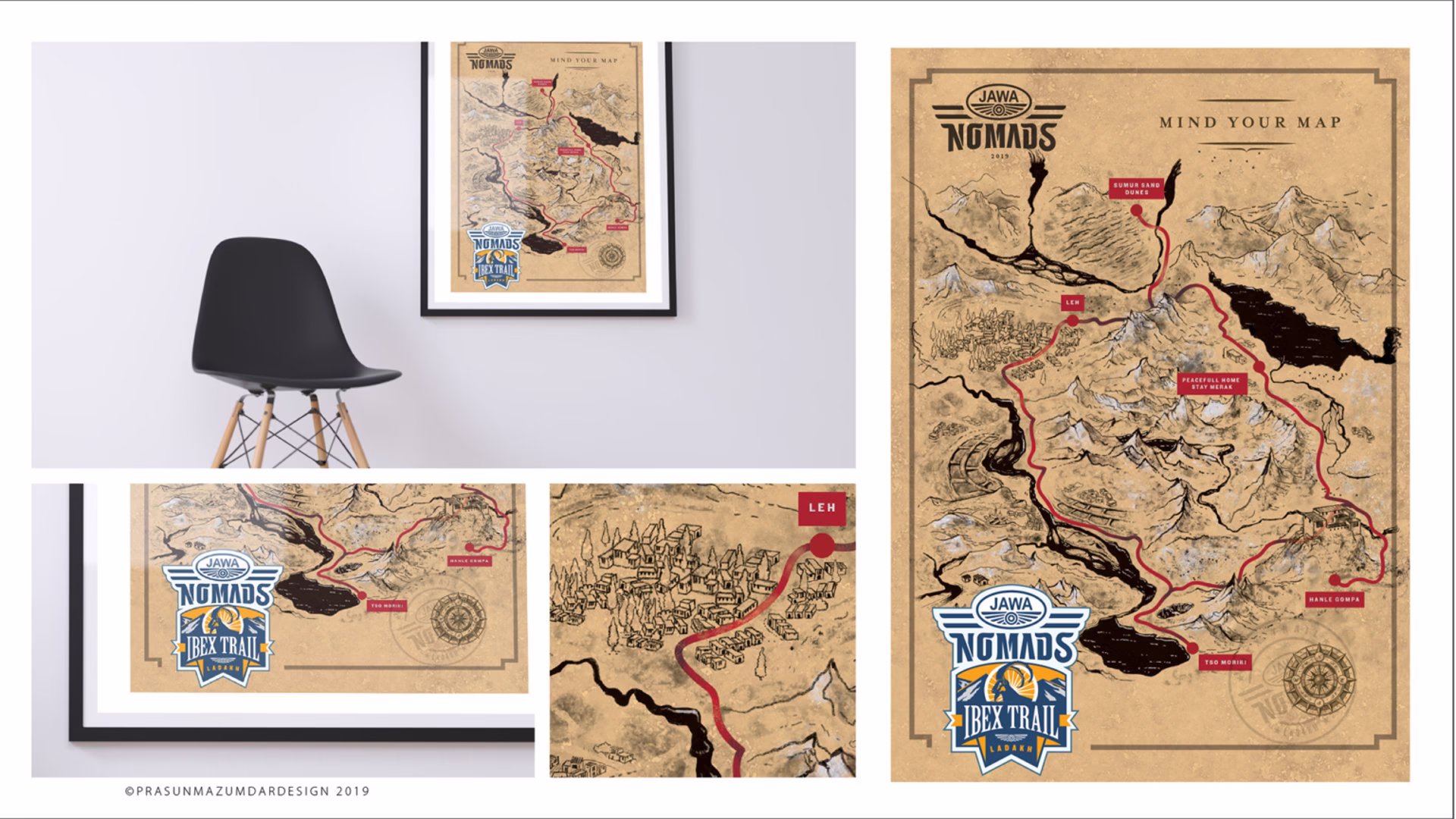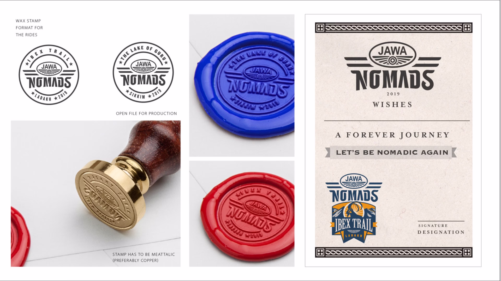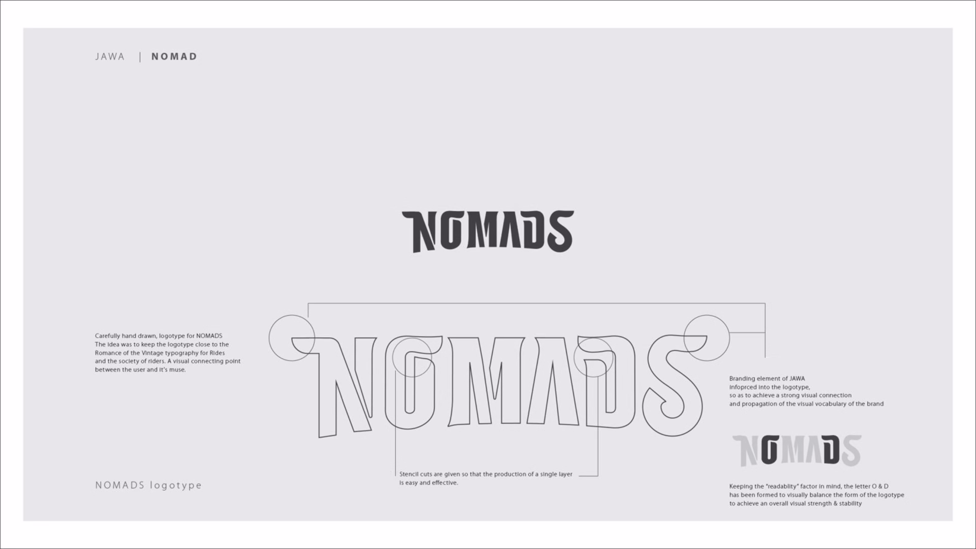 An anchored concept for all JAWA rides, Nomads fosters community engagement. Its logo, embodying vintage typography, serves as a visual connection, romanticizing the subculture and enhancing the bond between rider and muse.