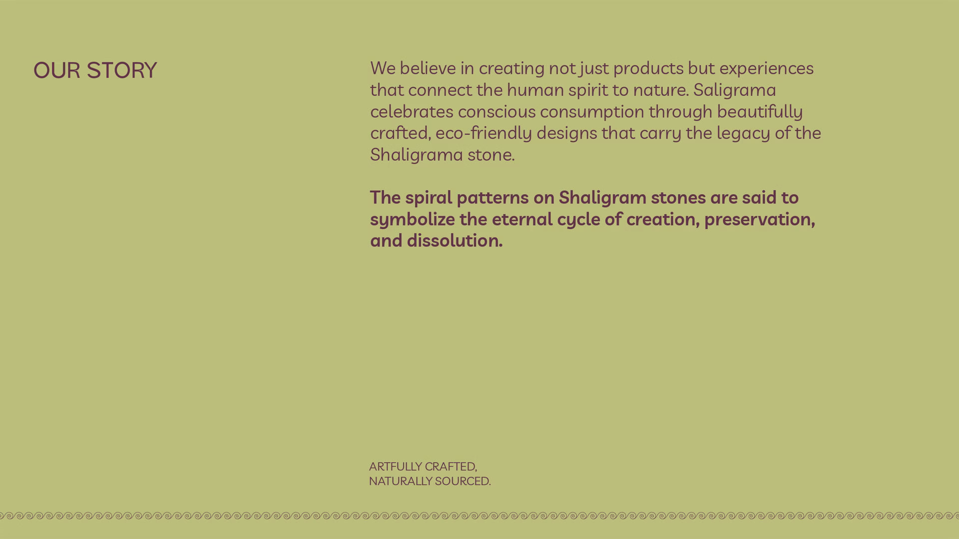 Saligrama builds a bridge between ancient ecological wisdom and modern sustainability by grounding its ethos in the symbolism of the Saligrama stone. Inspired by its golden spiral—eternal, precise, and divinely connected—the brand’s visual identity encapsulates the balance of nature and structure, infinity and form. The spiral, held within a minimal rectangular frame, mirrors our vision: beauty that evolves but remains rooted. We have translated this into product design that honors raw materials and embraces the imperfections of nature. Even with mechanized production, the detailing and care reflect craft-led precision, never losing touch with the human hand. The visual voice of Saligrama is bold and grounded. Natural colors, paired with striking typography, communicate a brand unafraid to lead conversations on climate, culture, and craftsmanship. The golden spiral—drawn from sacred geometry—is not just a symbol but a reminder that when we follow nature’s logic, we create not only sustainable design but enduring value.