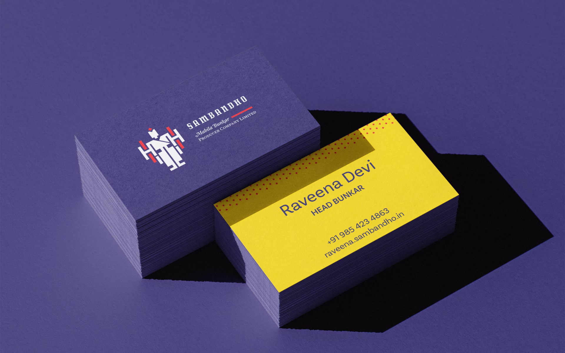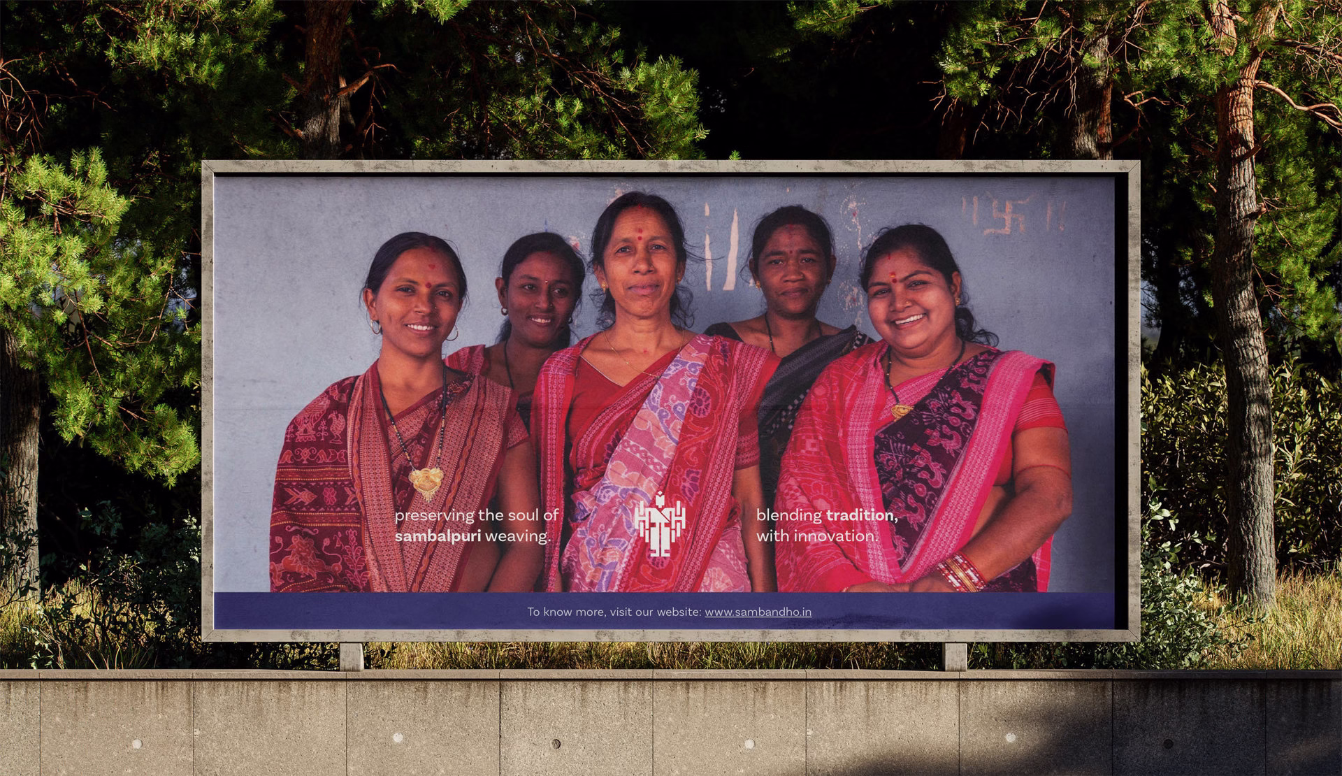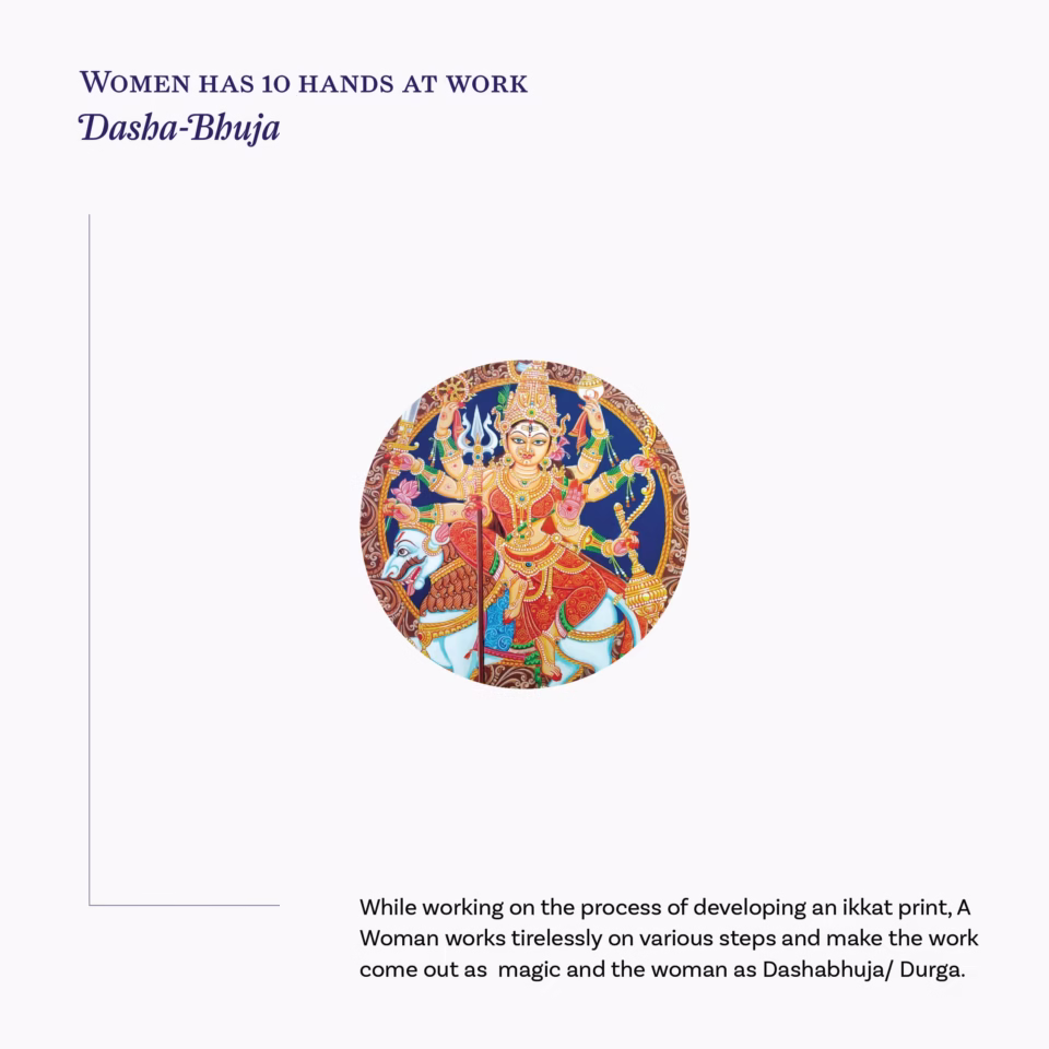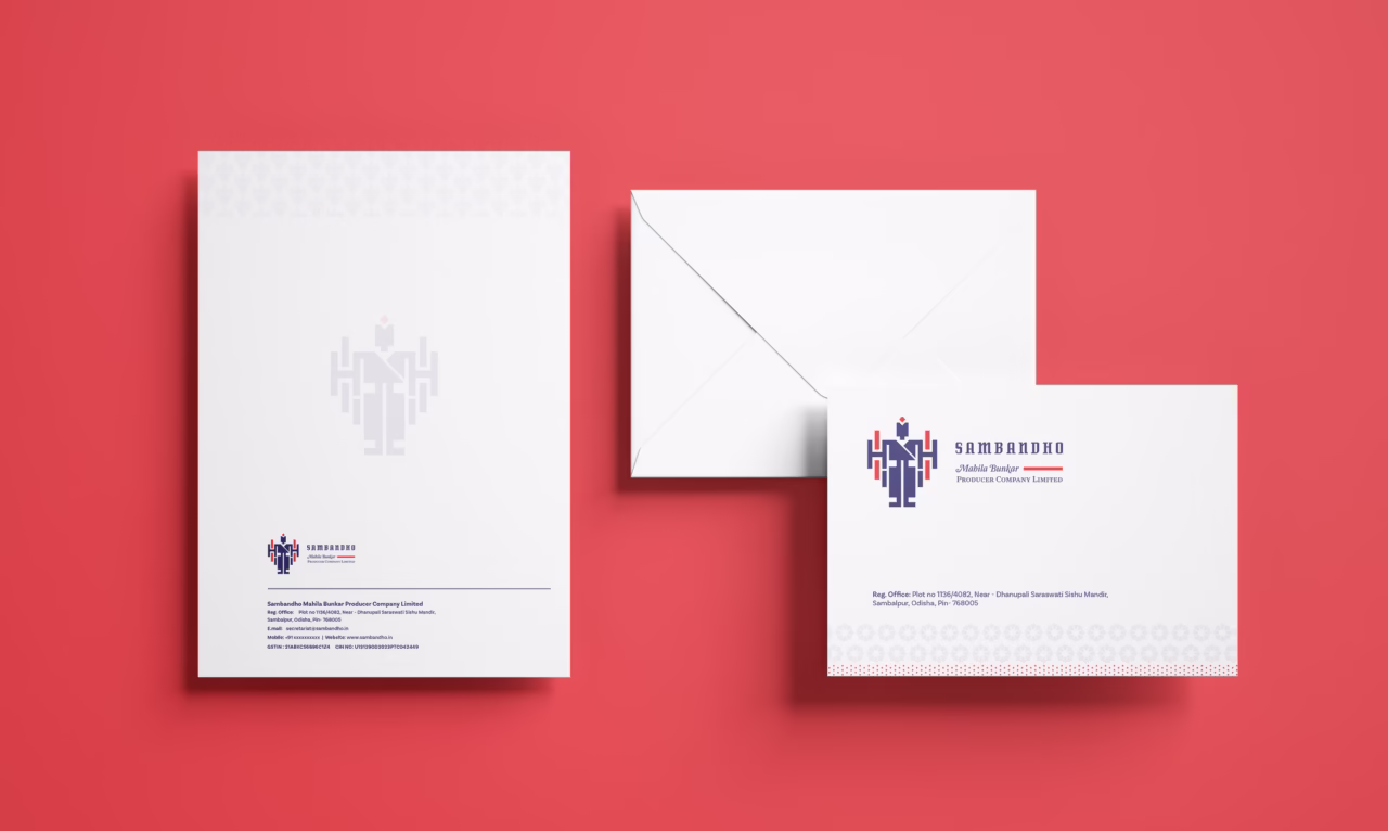 The identity of Sambandho reflects the soul of Odisha—its geometry, its myths, and its women. Inspired by the modern, structured depictions found in Odia art like Pattachitra, the logo captures the balance between divinity and craft. Imagined as a double knit of red and blue threads, the logo forms a female figure through the interlacing of weft and warp—an ode to both form and function. She appears with multiple hands, symbolizing the tireless, skilled nature of the women weavers, evoking the image of a goddess in motion. The visual language is completed by the Vriksha, or tree form, representing nurturing, continuity, and motherhood. Together, these motifs embody the strength, grace, and legacy of Sambandho’s women—whose artistry carries heritage into the future.