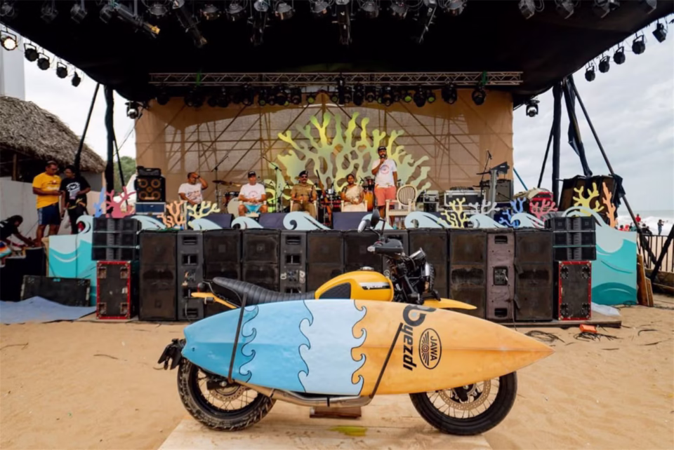 Jawa and Yezdi, though iconic, needed a fresh cultural narrative to engage with younger audiences and outdoor communities who resonate with adventure and exploration. The challenge was to create a visual language that could connect the thrill of riding with the festival’s surf and music vibe, while also ensuring that the brand presence extended beyond the event itself. This required a creative approach that translated branding and illustrations into merchandise, allowing festival-goers to carry the experience with them.