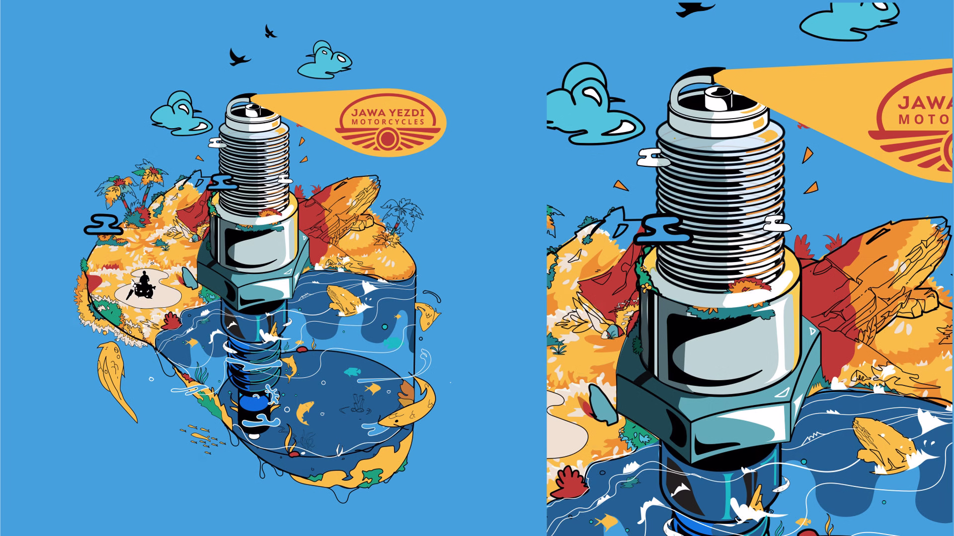 We developed a cohesive branding system and a series of original illustrations that merged surf and scramble culture into a bold, youthful visual style. These artworks were adapted into immersive event branding, on-ground activations, and finally into exclusive merchandise for each Jawa and Yezdi motorcycle model. This not only reinforced brand storytelling at the festival but also created lasting touchpoints for fans to connect with Jawa Yezdi as part of their lifestyle, well beyond the festival environment.
