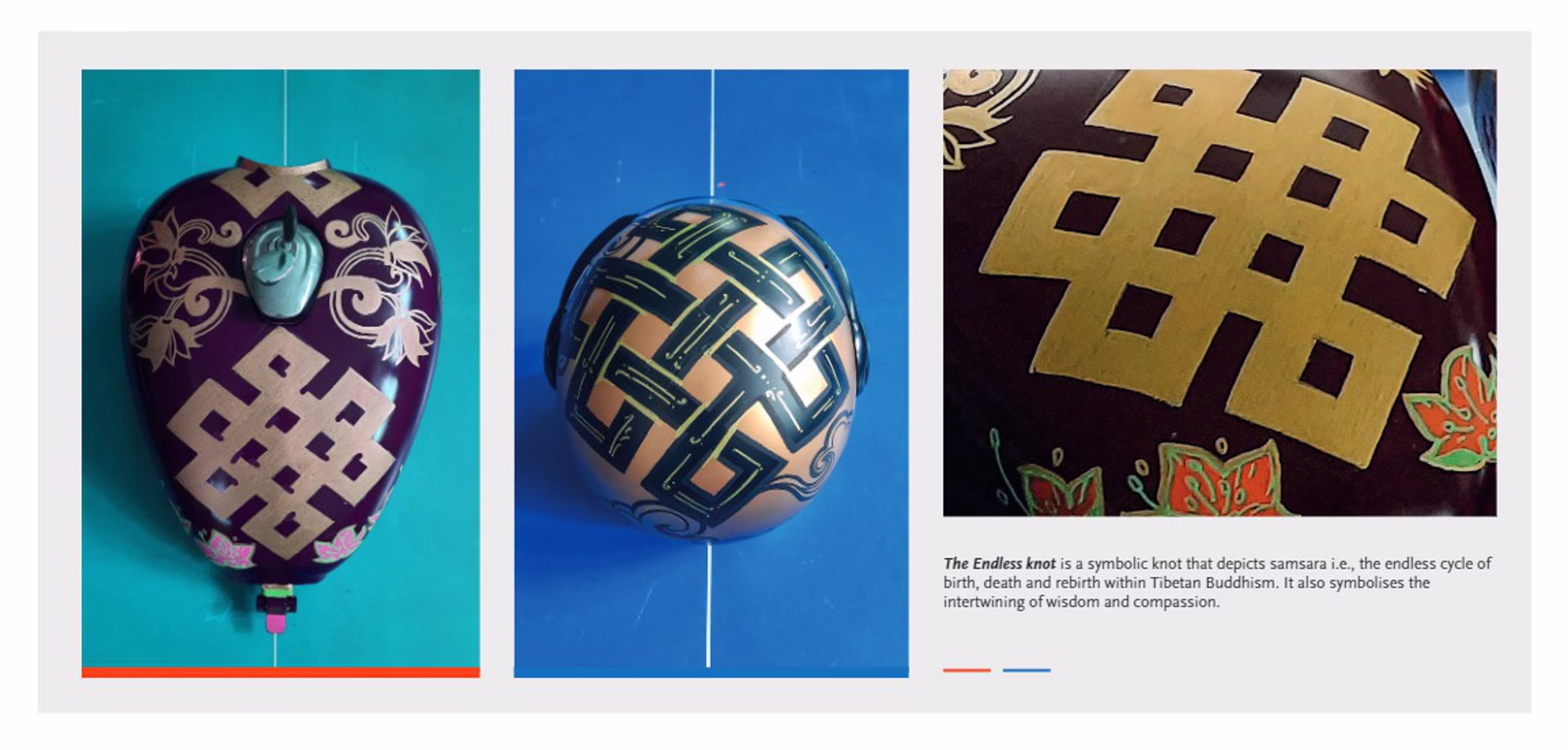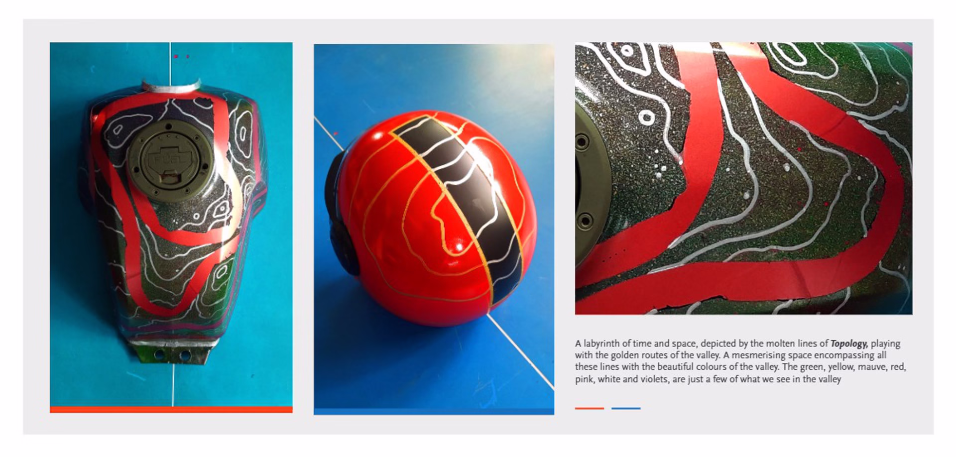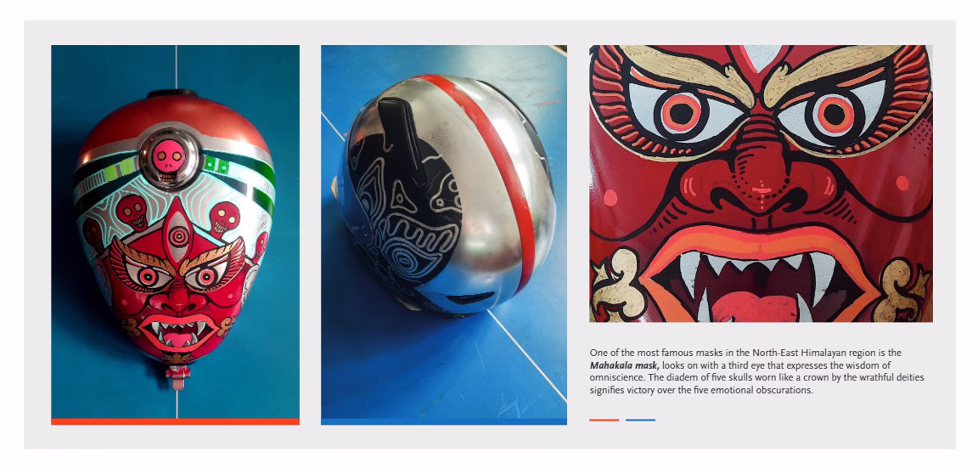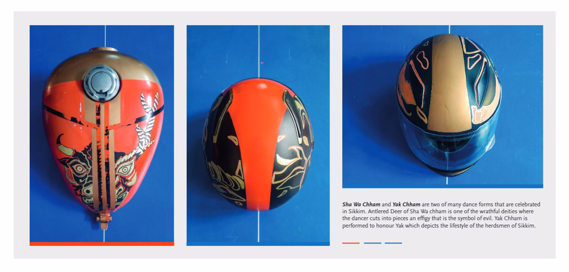 In collaboration with RE and UNESCO, the project was executed in two phases. The initial phase focused on designing the branding and communication strategy for TGHE project, while the subsequent phase involved creating art installations on six Royal Enfield bike tanks and nine helmets. This extensive planning and illustration were accomplished within an impressive 15-day timeframe.